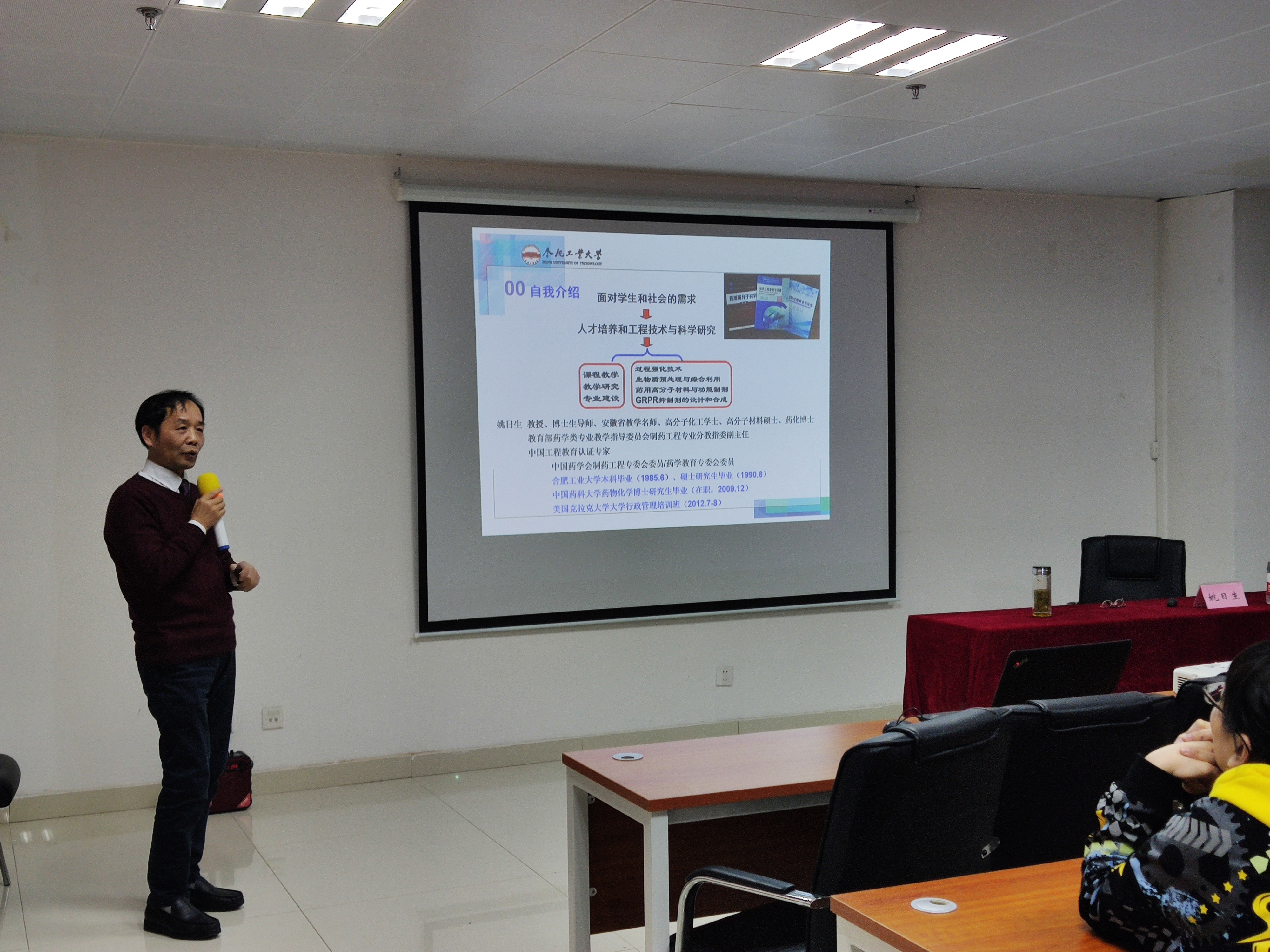 在主持人一段简短的嘉宾介绍之后,姚日生教授在同学们的热烈掌声中以一种极其幽默的方式开始了今天的演讲。姚老师先用一个个简单而又精确的数字回忆了自己的职业生涯:从在设计院工作的2年,到研究院的8年,再到太阳成集团工作至今的21.6年,姚老师兢兢业业,勤勤恳恳,从实际出发并结合理论,解决了无数的工程难题,为我国制药化工领域的发展做出了贡献。之后,姚老师结合以往的研究工作经验,将同学们带入过程工程的奇妙世界之中,告诉大家工程不是越复杂越好,简单的流程及装置系统更能体现工程的妙美,并带来高的效率和低的差错。
