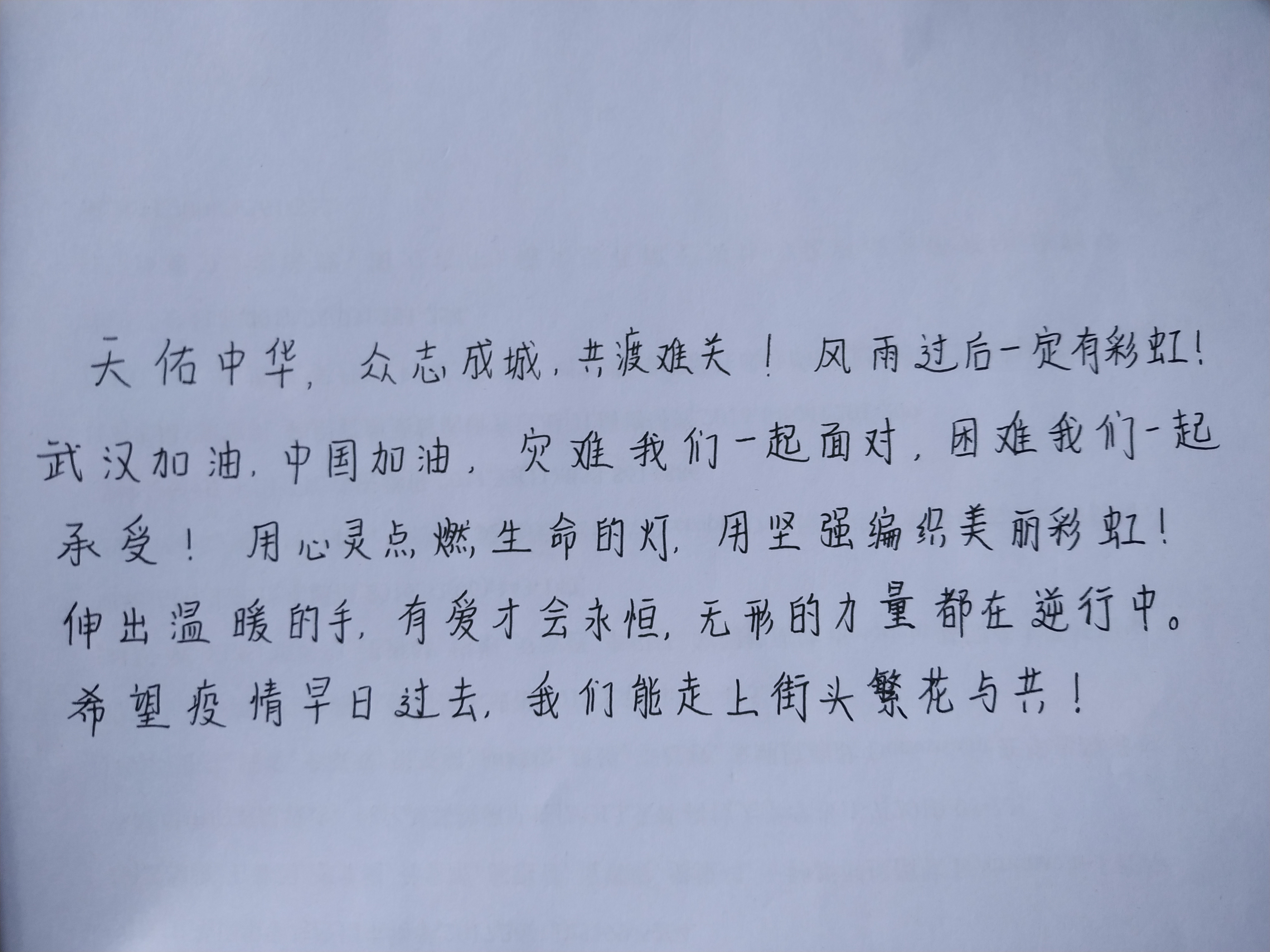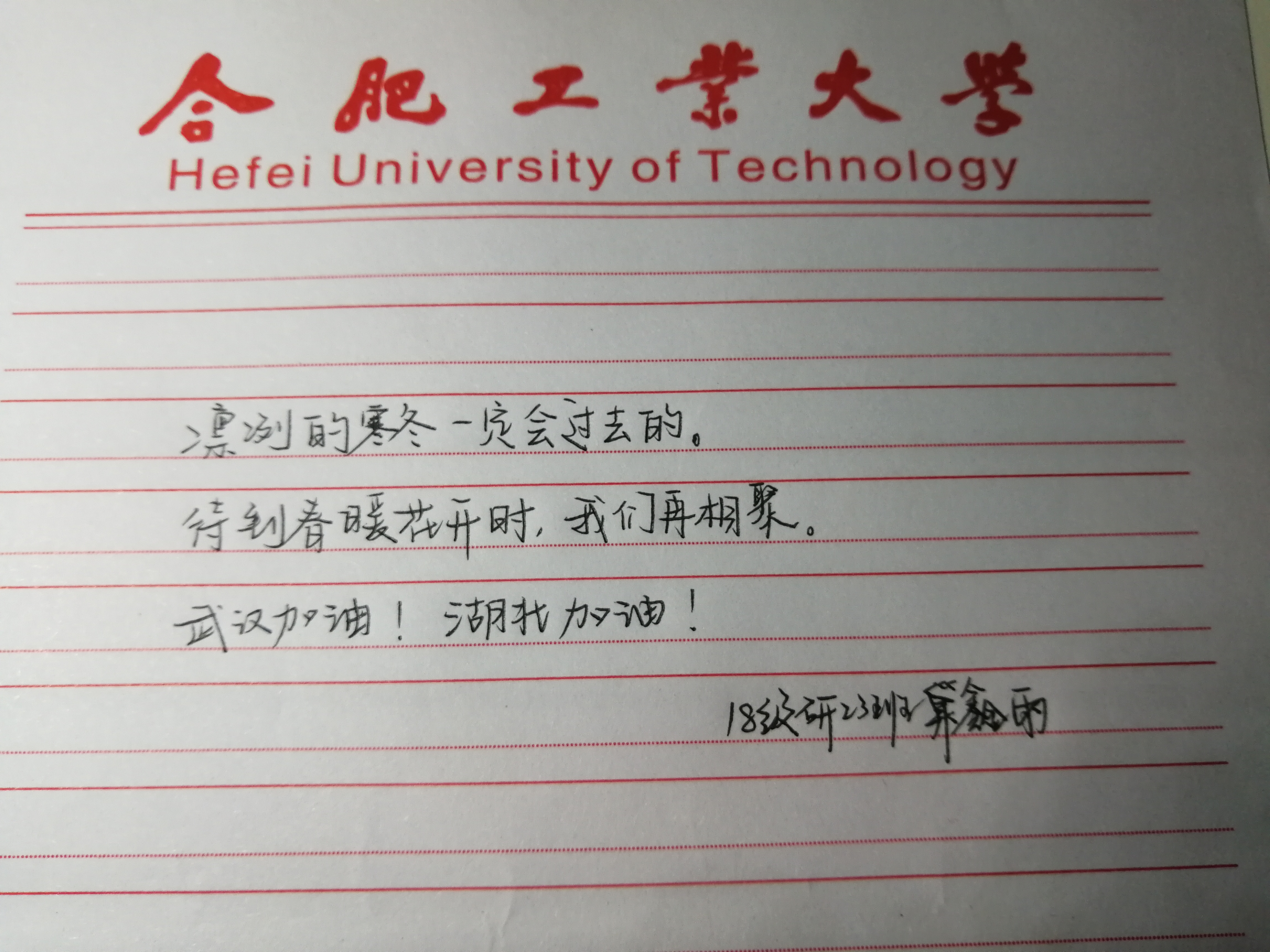 亲爱的武汉!这个二月,有份温暖想对你说!来自太阳成集团tyc151cc的小伙伴们积极响应疫情防控安排的同时,用图片谱写下自己对武汉想说的话语,一笔一画勾勒出对武汉、对国家最真诚的祝福,期待着战胜疫情的捷报传来!