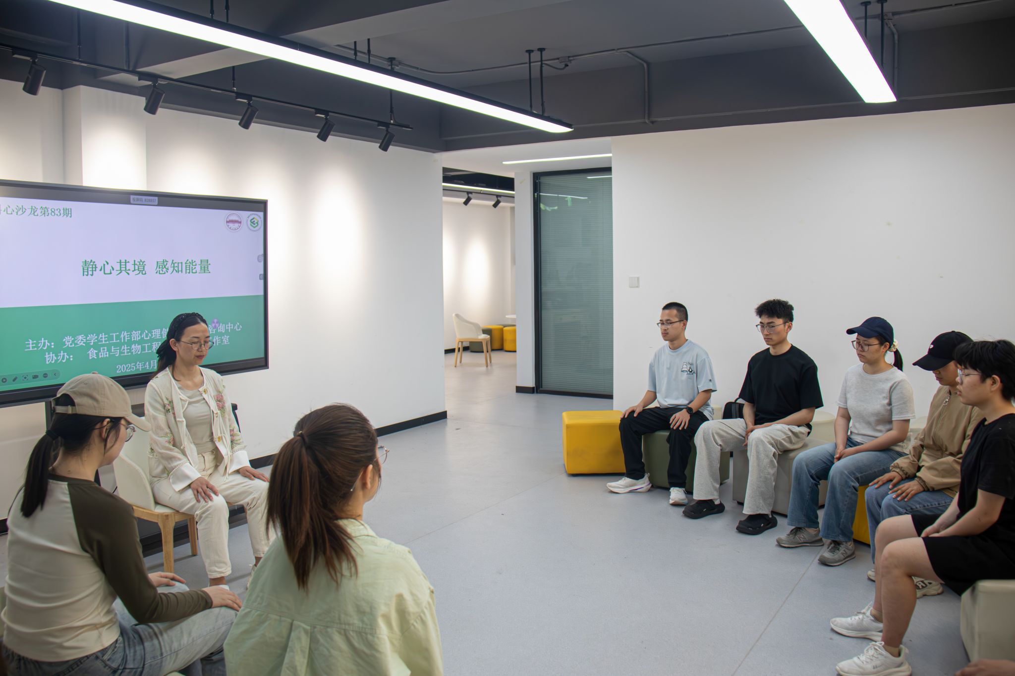 4月26日晚19:00,太阳成集团tyc151cc在翡翠湖校区6号宿舍楼学生社区沙龙空间举办斛心沙龙第83期(本科生专场)活动,主题为“静心其境 感知能量”,20余名本科生参与其中。本次沙龙由安徽省心理卫生协会理事金曼主讲,聚焦冥想主题,通过多元环节助力学生身心成长。