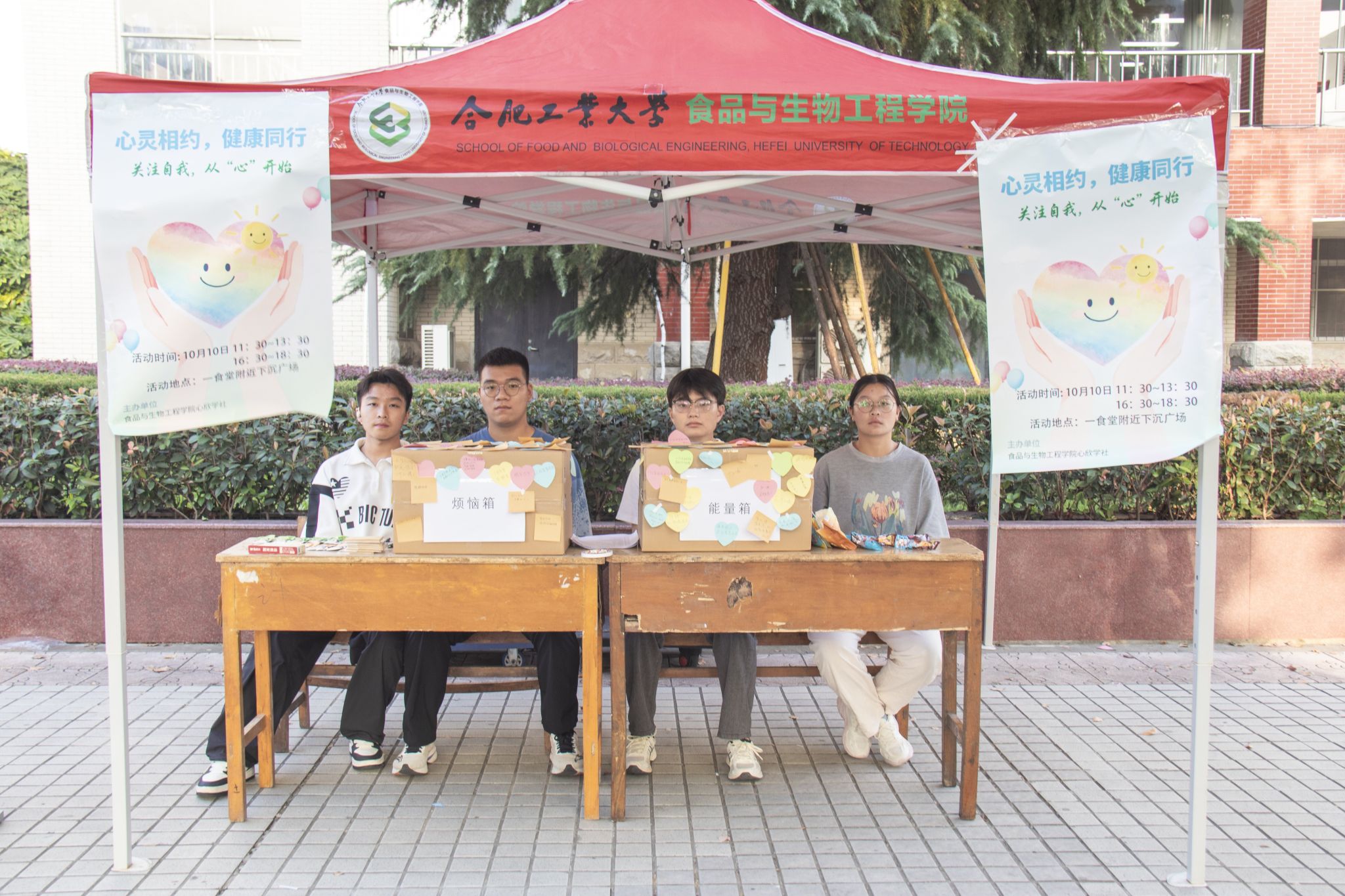 10 月 10 日当天,心欣学社在翡翠湖校区一食堂下沉广场搭建“心理健康互动体验区”,通过四项特色主题活动,让师生在参与中释放压力、收获心理保健知识。
