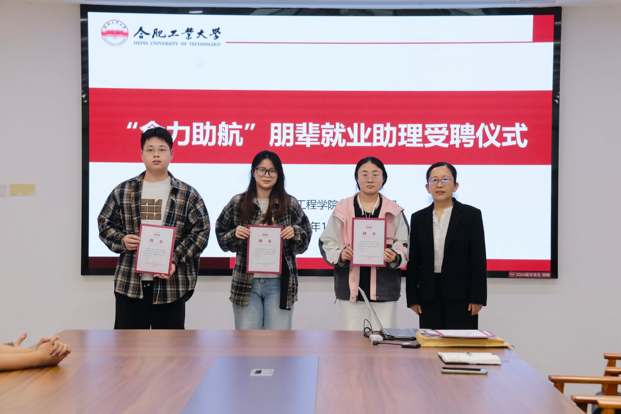 仪式伊始,葛永莉详细介绍了本次朋辈就业助理选聘的背景、队伍结构、队伍职责和队伍目标。随后,李艳对工作队伍提出具体工作要求:一是,提高站位,助力精准化就业;二是,利用平台,实现全方位发展;三是,协同发力,织密朋辈互助网络。接着,与会老师为受聘学生一一颁发证书。