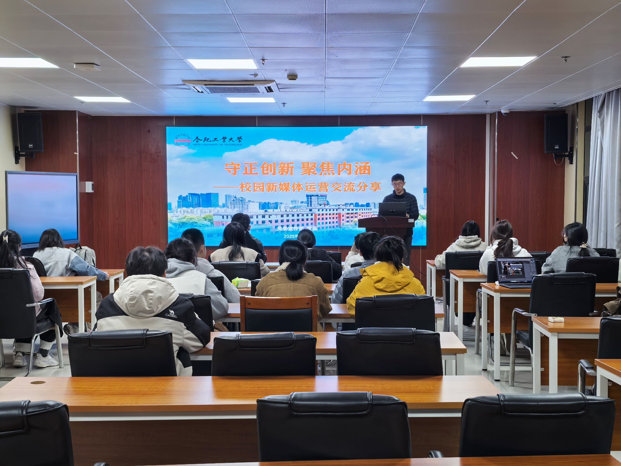 培训伊始,雷磊向同学们介绍当今新媒体的特点。针对学院日常工作实践中常见的素材稀缺、技术短板、视觉呈现不足等实操难题,以校园新闻一线案例为教材,系统解析摄影构图等核心技巧。在具体讲解中,雷磊通过对比普通照片与新闻作品的差异,向同学们拆解如何将平凡场景转化为共情素材,提醒学员关注信息密度和提升个人审美。最后,雷磊结合自己带领团队打磨作品的经历和多年宣传工作经验,希望同学们不忘初心,做有情怀,做有温度的校园记录者,让正能量充满校园网络空间。