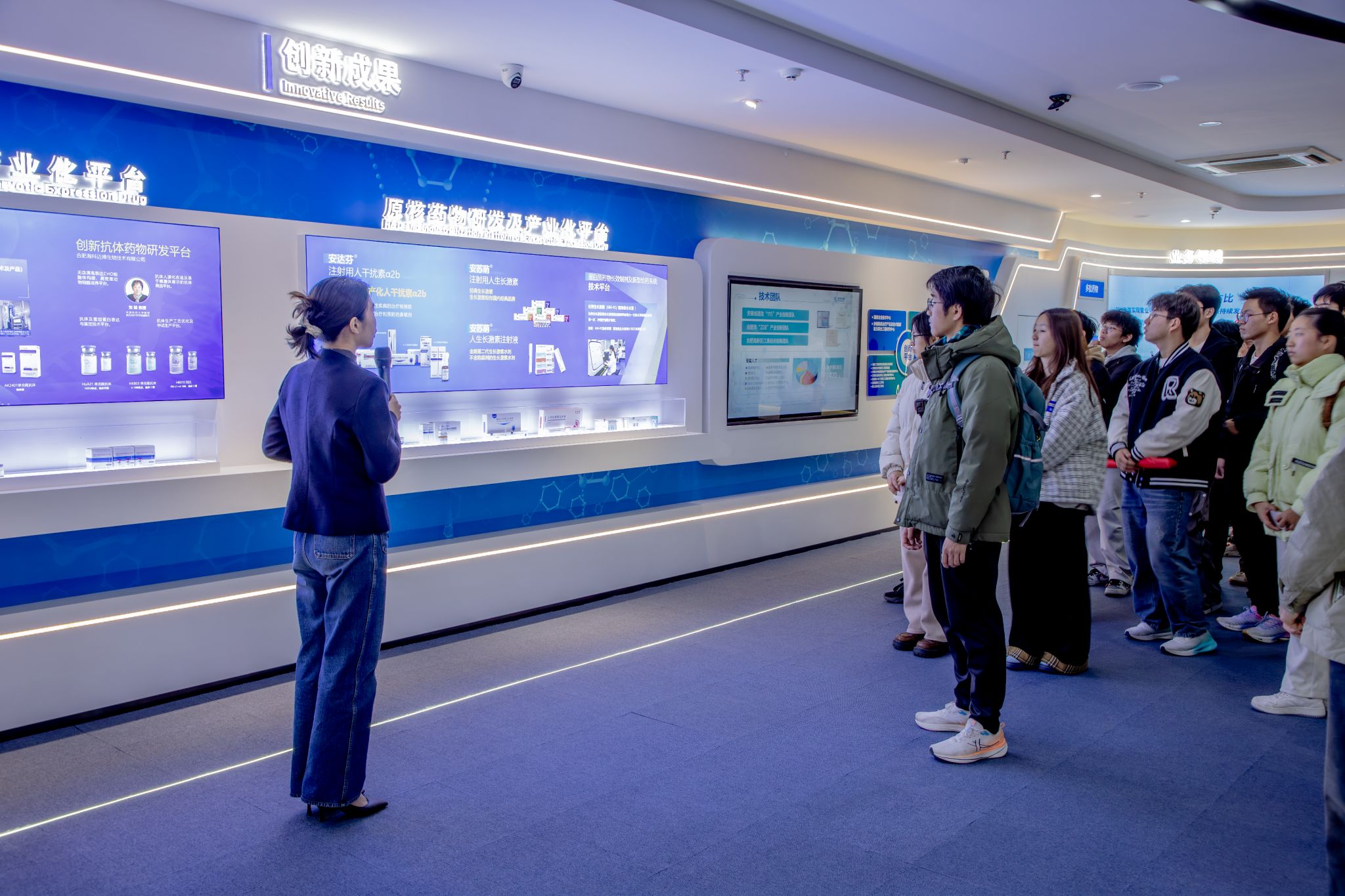 在安科生物工程股份有限公司,师生们在内容设计专员汪雨晨的引导下,共同参观了安科生物文化长廊,系统了解了细胞工程产品、基因工程产品等生物技术药品的研发和核心技术能力的构建。随后,讲解员展示了安科生物旗下系列产品,并在研发实验室参观走廊,详细地介绍了研发成品从上游到下游再到检测的生产过程,拓宽了同学们对研发和生产生物制品的认知。