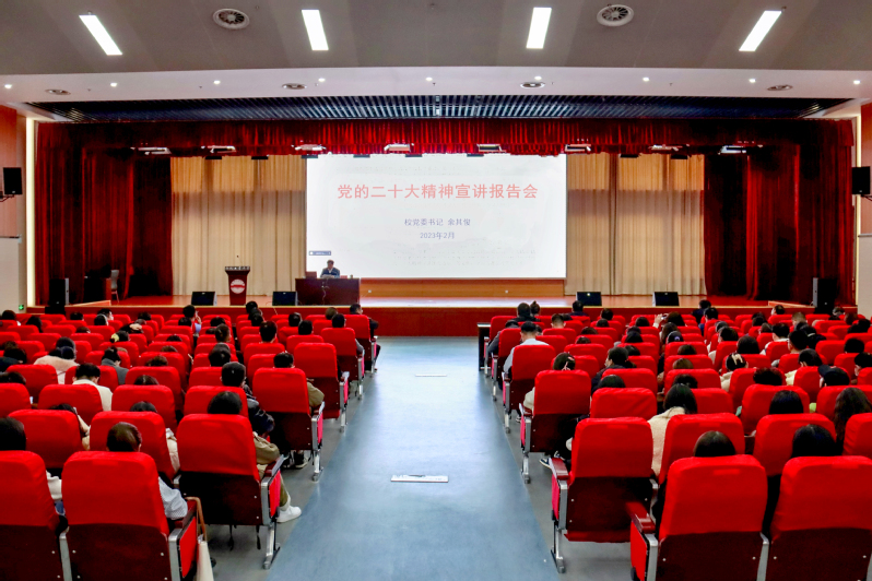 2月28日,校党委书记余其俊在翡翠湖校区科教楼二楼报告厅为我院师生宣讲党的二十大精神,学院全体教工、学生代表等400余名师生参会。报告会由学院党委书记陈树海主持。