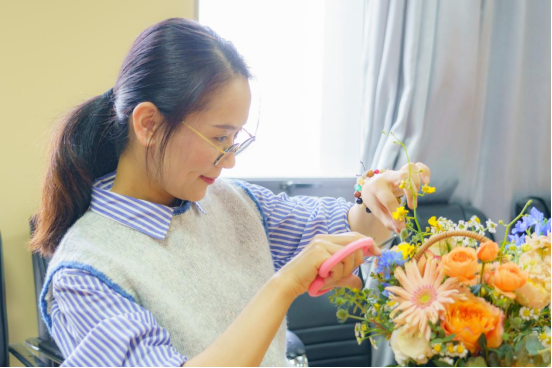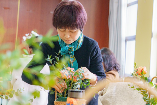 现场花香弥漫,笑声不断,女教职工们都将自己从忙碌的工作中短暂地脱离出来,全身放松地投入到自己的创作中。