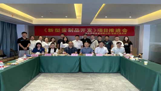 推进会由团队负责人李述刚教授主持。中国畜产品加工研究会副会长蛋品加工专业委员会主任委员马美湖教授致辞,首先对本次推进会的召开表示热烈祝贺,对来访参加此次推进会的嘉宾表示热烈欢迎,简要介绍了湖北宇祥公司是我国蛋品出口的主要公司之一、合肥工大蛋品营养与加工团队两年多来快速发展等双方优势。团队成员详细地汇报了Q弹卤蛋和溏心卤蛋的研发过程中已攻克的技术难题、已成型的生产工艺等,并进行了阶段性成果总结。结合产品的研发情况,大家同时品鉴Q弹卤蛋和溏心卤蛋两个中试产品。针对项目进展汇报和产品品鉴情况,秦祖华主任、高艳兵副主任、冯林总经理等均给予了重要的发言指导。大家发言后,还进行了热烈的讨论、交流。在讨论中,对产品研发阶段性成果、市场定位、下阶段工作部署以及深化合作进行了探讨。冯林总经理特别指出,半年研发时间,项目完成了70%的研发任务,但由于市场竞争的激烈,要进一步把产品研发到极致。此次会议以后,双方将进一步讨论交流,确立后续的研发内容、工作重点和阶段性目标。