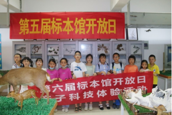 接下来,参观学校生物标本馆活动开始。学校生物标本馆由我院王军辉教授负责建设,经过10多年的积累,馆内现已收藏自制动植物标本4000多件,藏有多件学生参加标本大赛获奖作品,是一个优良的自然科学教育实践基地。孩子们在家长的陪伴下带着好奇有序参观了标本馆。参观全程由学院生命科学协会的学生志愿者对馆藏标本进行科普讲解,介绍各种标本以及动植物标本的制作工艺,对部分参赛作品的立意和制作过程进行讲解。参观过程中穿插提问环节,增强了参观的互动性,既传授了生物学知识,又激发孩子们探索生命科学的渴望。