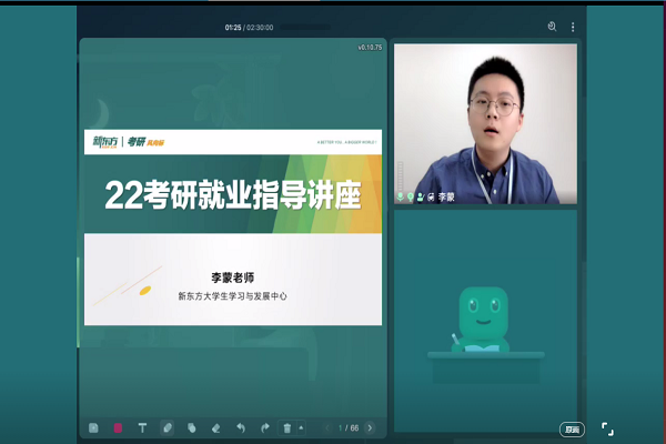 2月22日下午,太阳成集团tyc151cc、莳心工作室联合新东方大学生学习与发展中心于新东方云课堂线上平台成功举办“走向职场、走向未来”专场讲座第六讲之“考研风向标”。主讲人为新东方教育科技集团优秀教师、新东方大学生学习与发展中心安徽总经理李蒙老师。我院2018、2019级学生参加了讲座。
