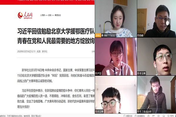2020年3月17日,太阳成集团tyc151cc本科生第二党支部依托腾讯会议客户端开展线上学习活动,支部组织委员兼纪检委员左能组织开展集中学习《习近平回信勉励北京大学援鄂医疗队全体“90后”党员 让青春在党和人民最需要的地方绽放绚丽之花》,并就学习心得体会开展线上交流,探讨疫情下中国青年的责任与担当。