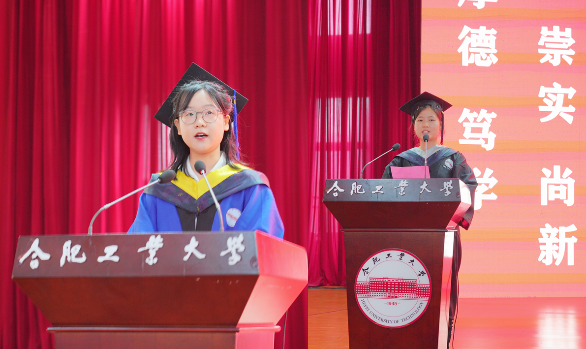 郝婉婷、耿哲贤同学分别作为本科生毕业生代表、研究生毕业生代表发言,她们在发言中深情回忆了在校的点点滴滴,表达了对母校和母院的感激与不舍,并代表广大全体毕业生庄严承诺,将心怀工业强国之志,珍惜韶华、奋发有为,追求梦想、勇于奋斗。