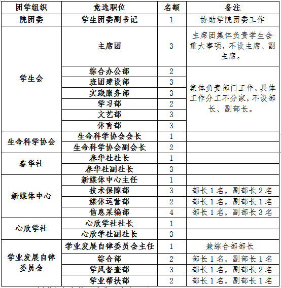 学生会设主席团成员3名,工作部门成员16名;生命科学协会设会长1名,副会长2名;春华社设社长1名,副社长3名;新媒体中心设主任1名,部长团9名;心欣学社社长1名,副社长3名;学业发展自律委员会设主任1名,部长团7名。此次竞选,学生会主席团面向学院2020级本科生,新媒体中心主任面向2020级本科生,其余职位面向2021级全体本科生。鼓励符合条件的、未在团学组织工作过的同学积极参加本次换届竞选。