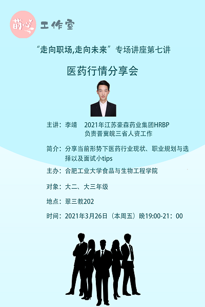 活动介绍:“走向职场、走向未来”专场讲座第七讲之“医药行情分享会”,特邀江苏豪森药业集团李靖先生,分享当前形势下医药行业现状、职业规划与选择以及面试小tips。