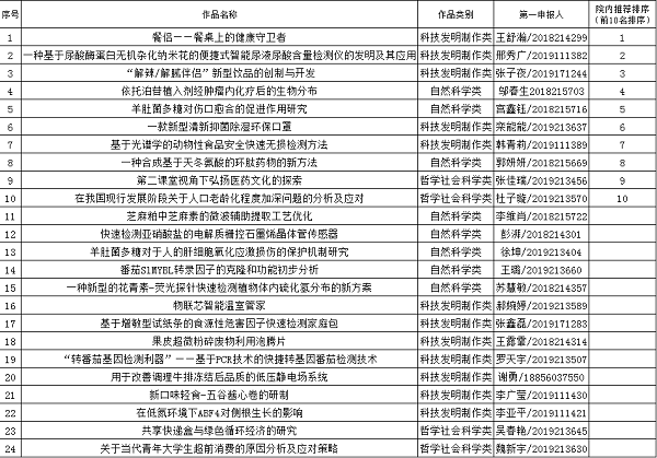 学院竞赛工作小组共收到申报作品24件,其中自然科学类学术论文8件、哲学社会科学类(学术论文和社会调查报告)4件、科技发明制作类12件。本着公平公正公开的评审原则,经学院初评,现将初评结果(推荐排序前10作品)公示如下: