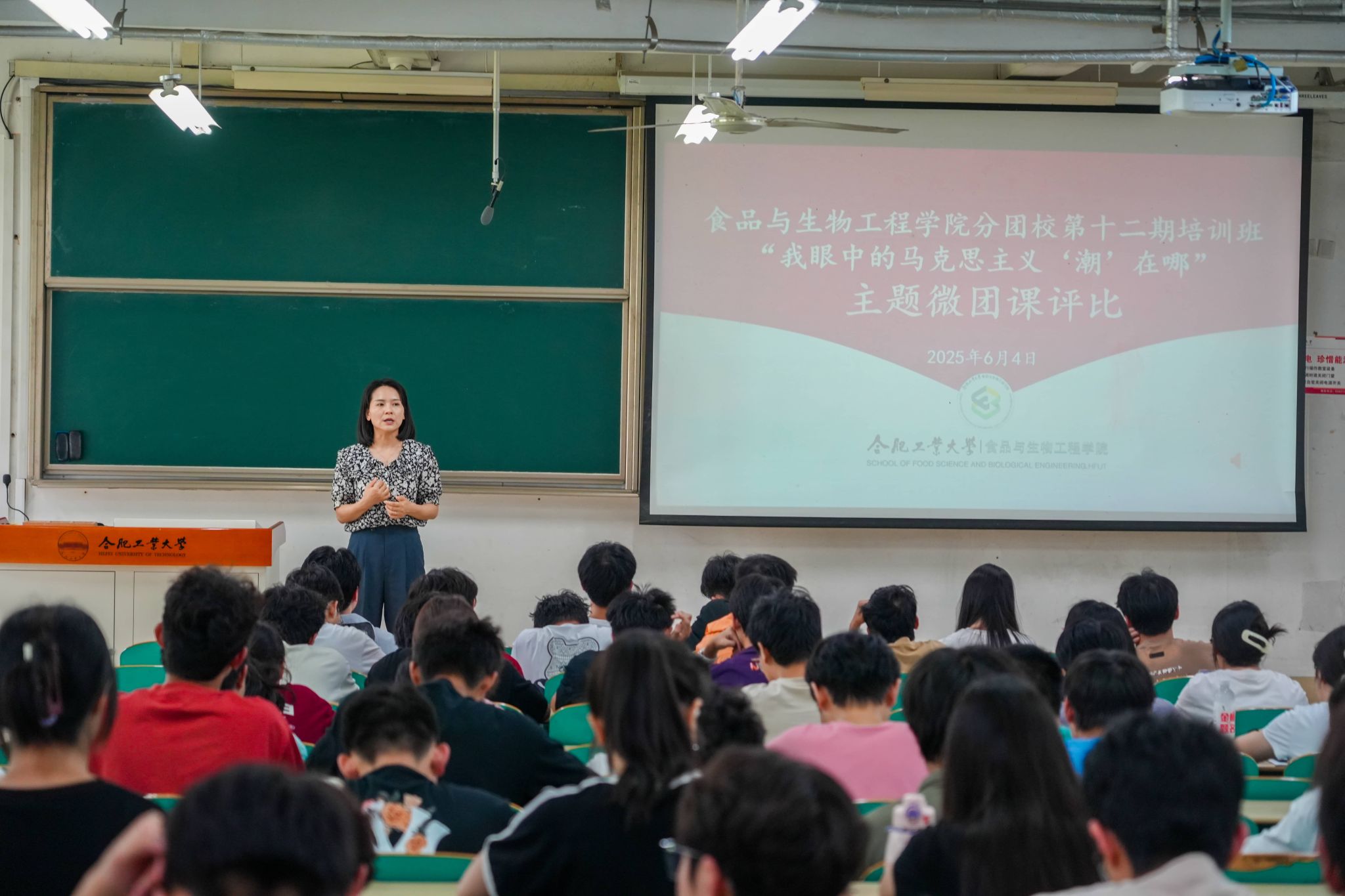 6月4日下午,太阳成集团tyc151cc在翠五教104举办“我眼中的马克思主义‘潮’在哪?”主题微团课比赛。学院团委副书记葛永莉和第十二期团校学员班140余名学员共同参加。此次比赛围绕“我眼中的马克思主义‘潮’在哪?”的话题,分十个小组进行评比,全员参与课程评比打分,分别从理论深度、内容创新、现场表现和团队合作四个方面进行评分。微团课评比过程中,各组通过PPT进行授课,同学们拟定了如“食品科技自立自强的‘红色引擎...